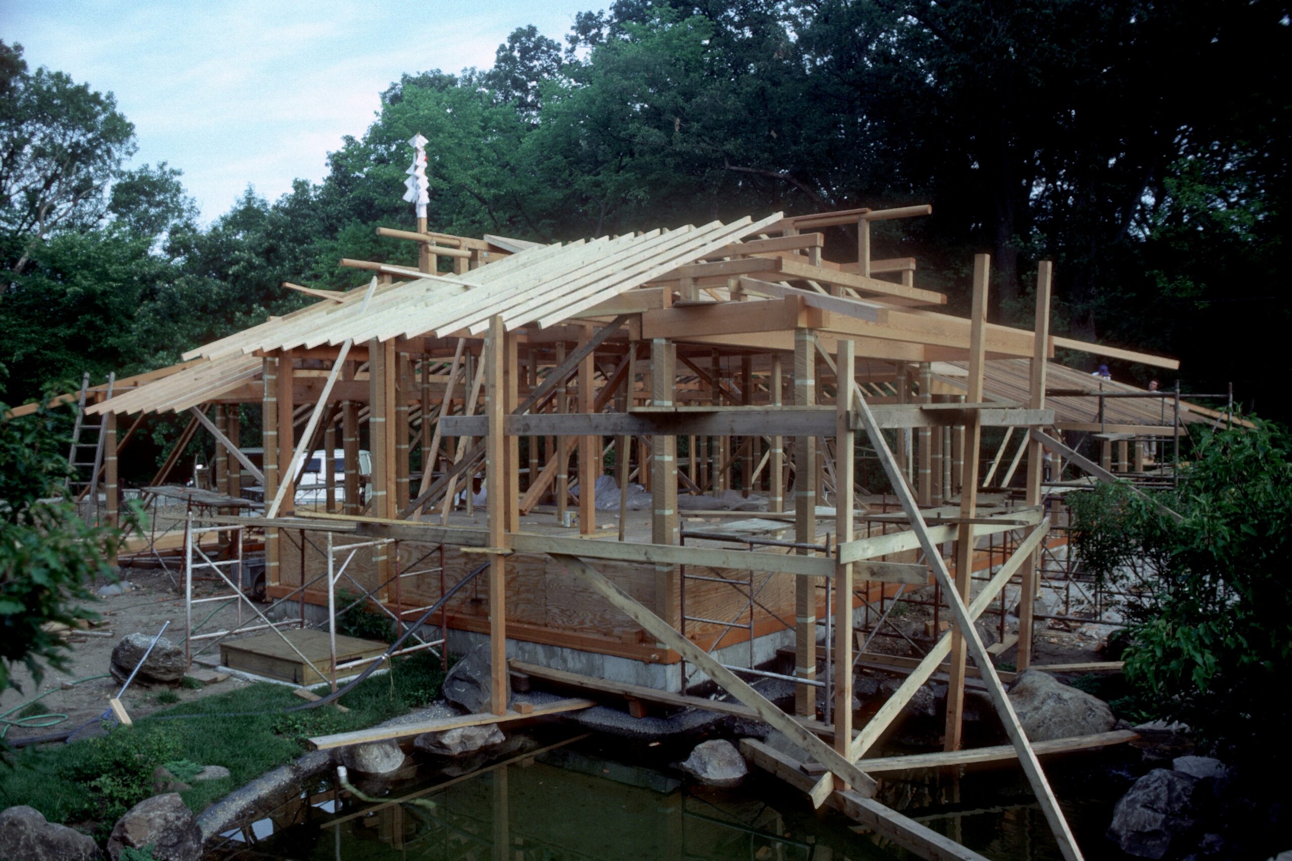1980: Viewing House and Zig-Zag Bridge constructed in the Pond Strolling Garden
